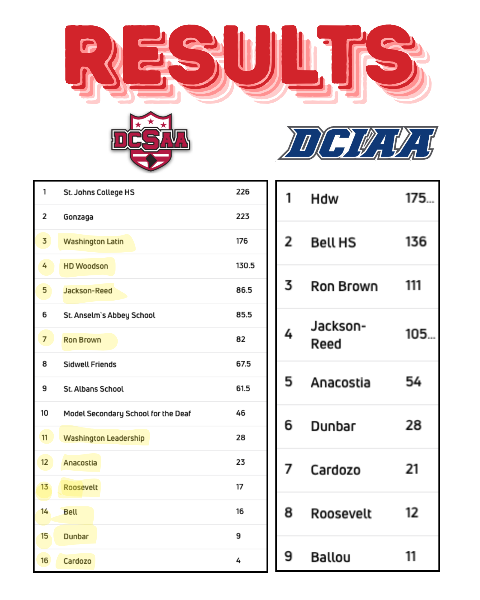 Thursday, 2/7, nine public schools competed at the DCIAA Championship; and Saturday, 2/14, sixteen schools competed at the DCSAA State Championship